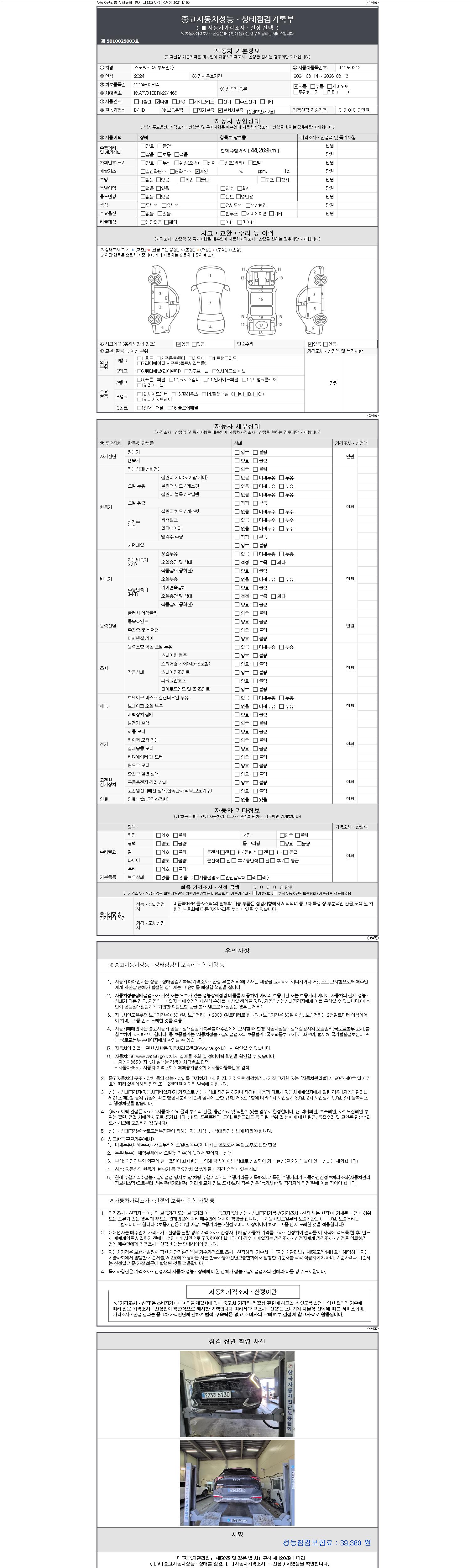| 주행거리 | 44,269 km | 차량번호 | 110모9313 | 사고유무 | 성능기록부 참조 | 제시번호 | 제 2147483647 호 |