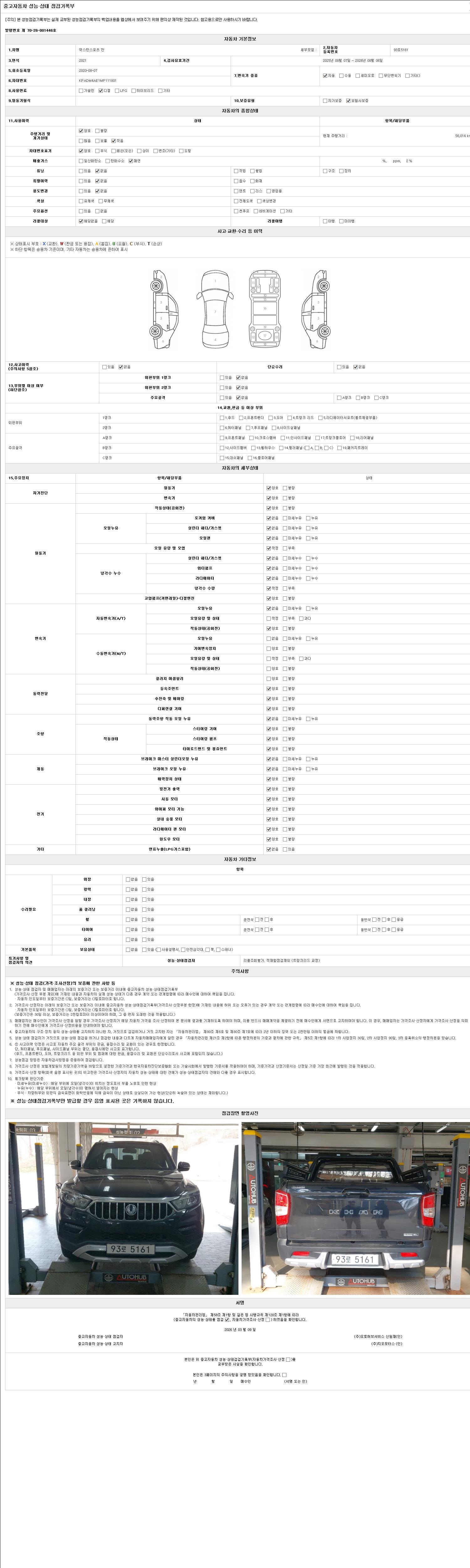 | 주행거리 | 56,014 km | 차량번호 | 93로5161 | 사고유무 | 성능기록부 참조 | 제시번호 | 제 2147483647 호 |
