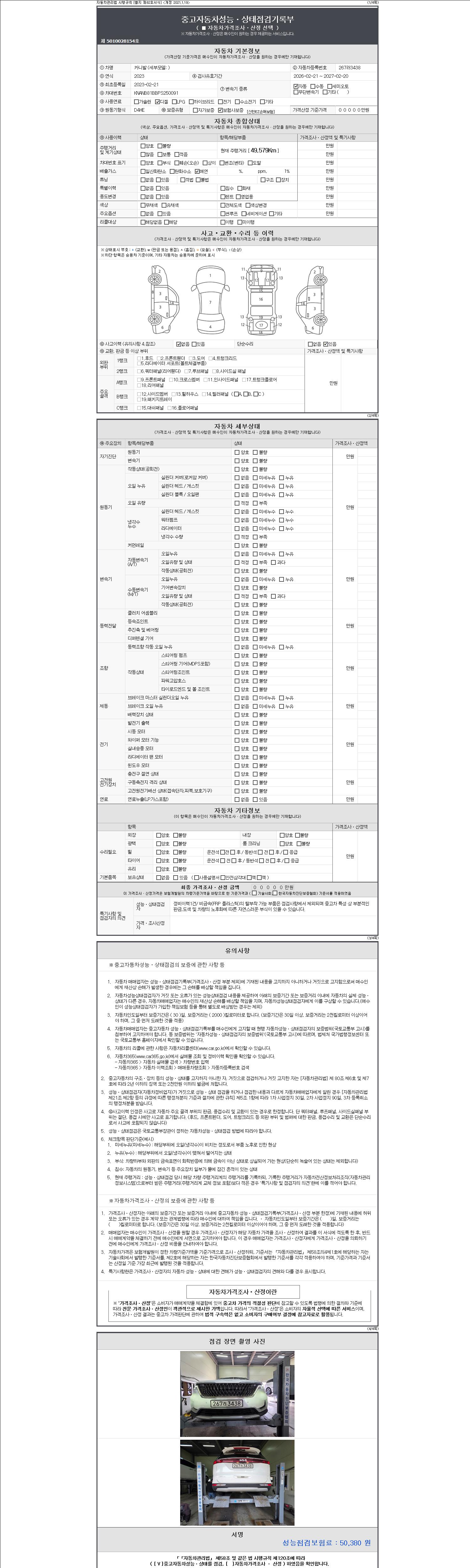 | 주행거리 | 49,579 km | 차량번호 | 267러3438 | 사고유무 | 성능기록부 참조 | 제시번호 | 제 2147483647 호 |